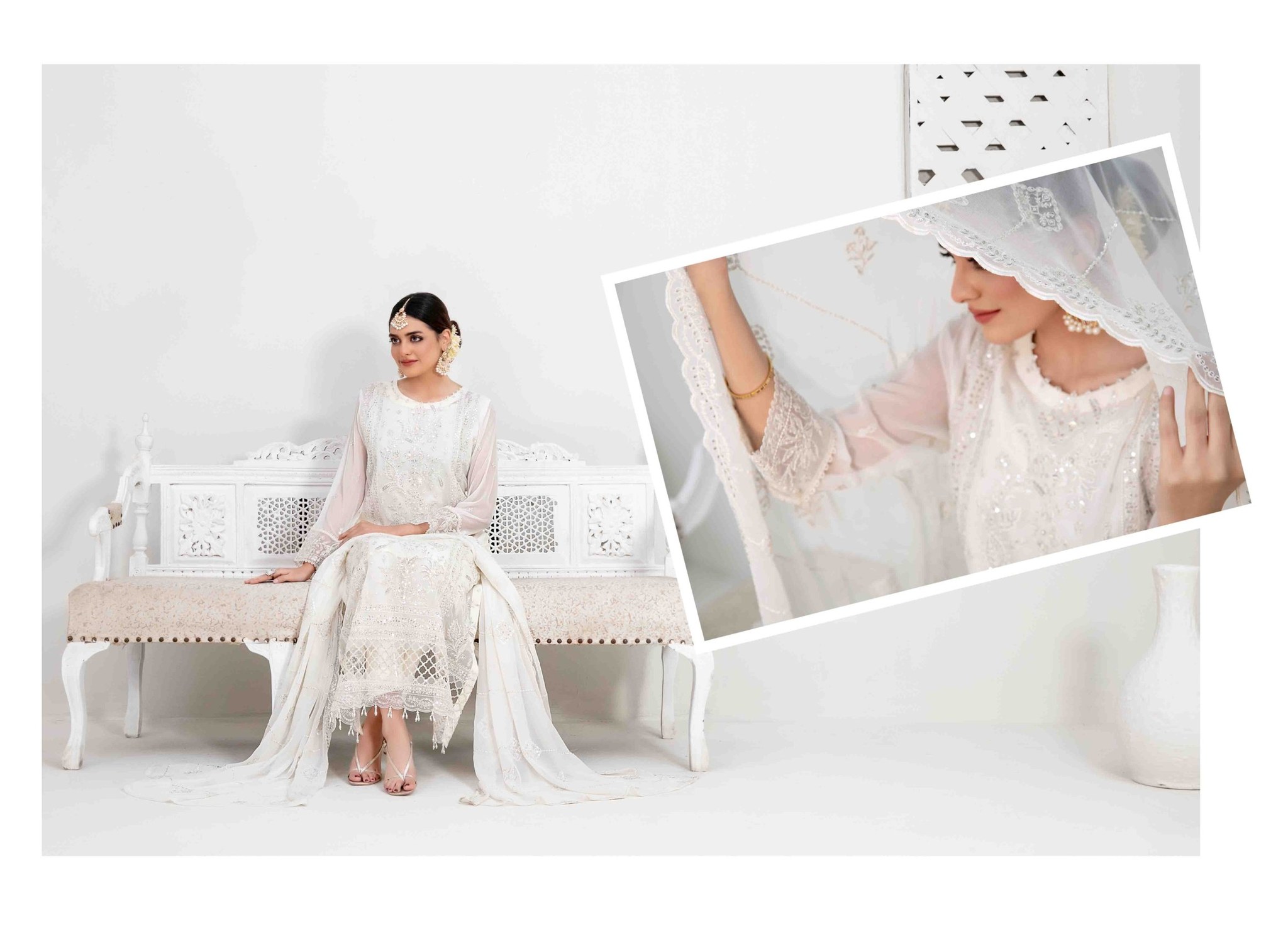Rashieka embroidered fancy chiffon collection by tawakkal fabrics. Elegance redefined with exquisite embroidery and handwork! This stunning semi-stitched chiffon suit is paired with a ready embroidered chiffon dupatta and a luxurious jacquard viscose trouser. Perfect for every festive occasion!